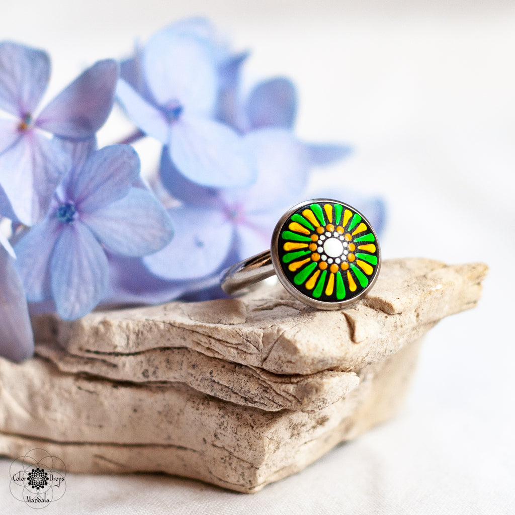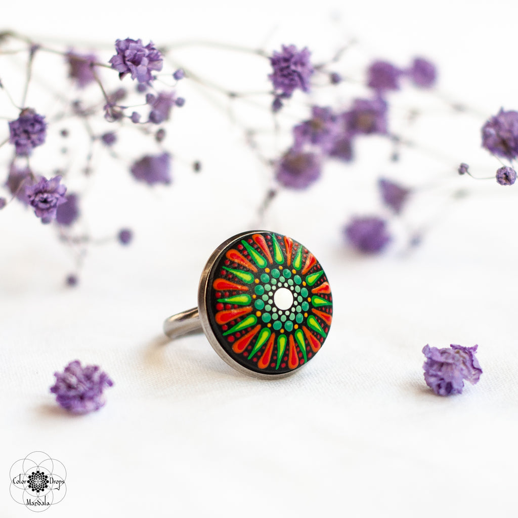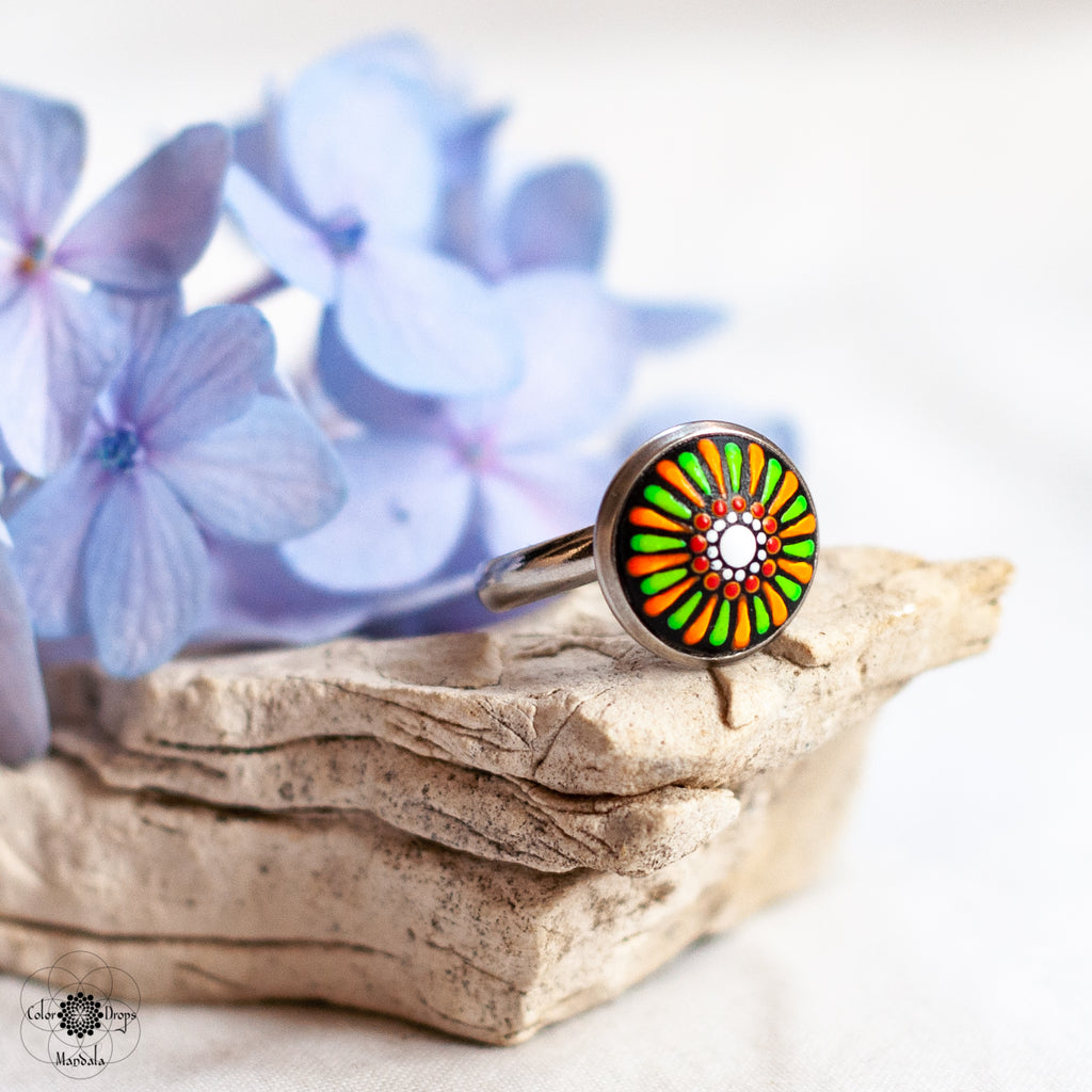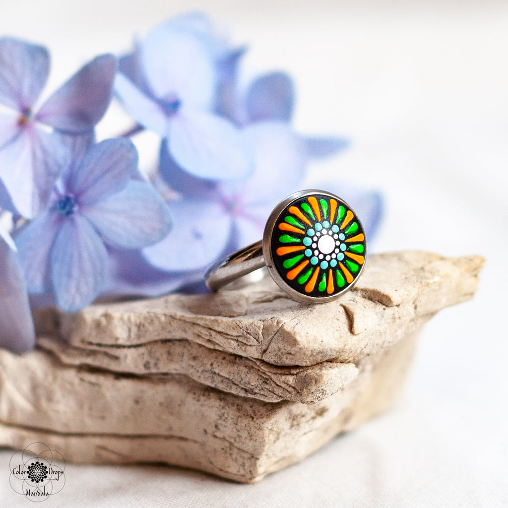 Inel Mandala "Flower power" - Portocaliu & Verde