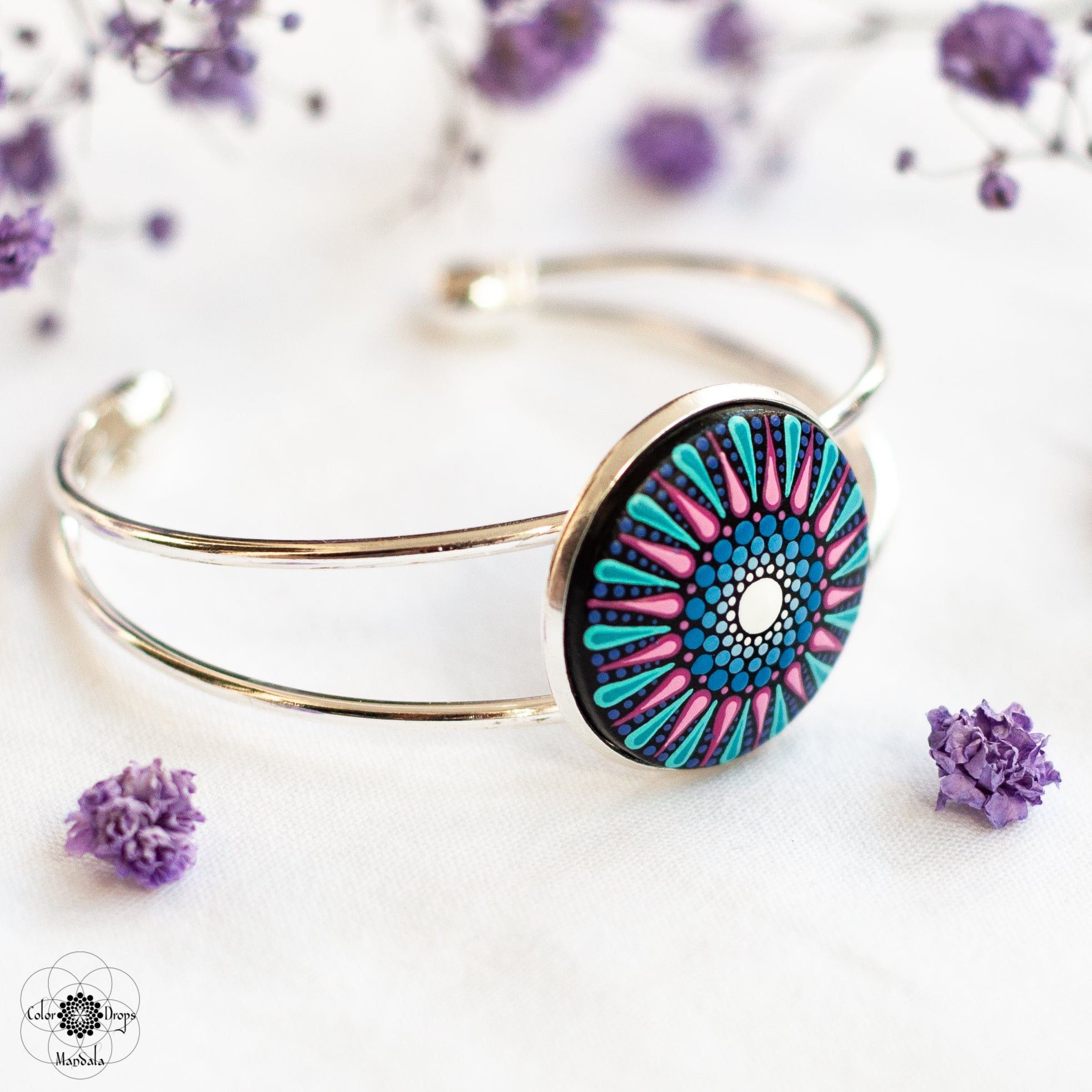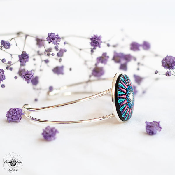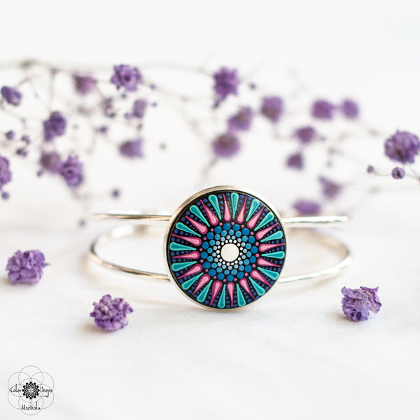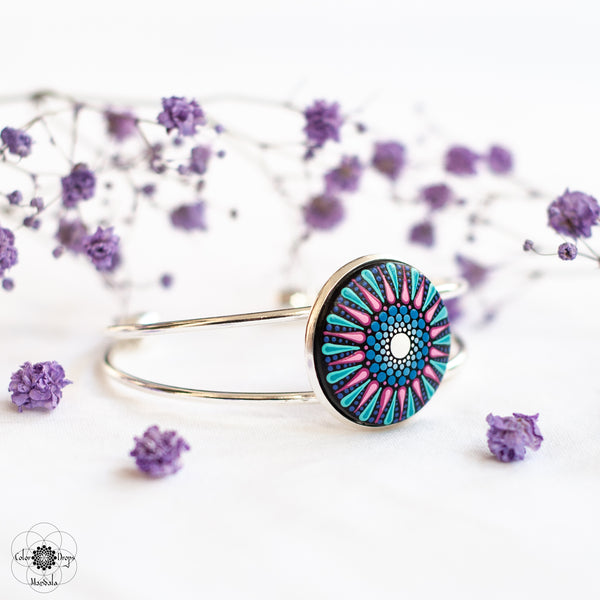 Brățară Mandala pictată manual pe suport din lemn cu culori acrilice pe bază de apă. Produsul este lăcuit cu două straturi de vernis lucios, non-toxic, rezistent la apă.