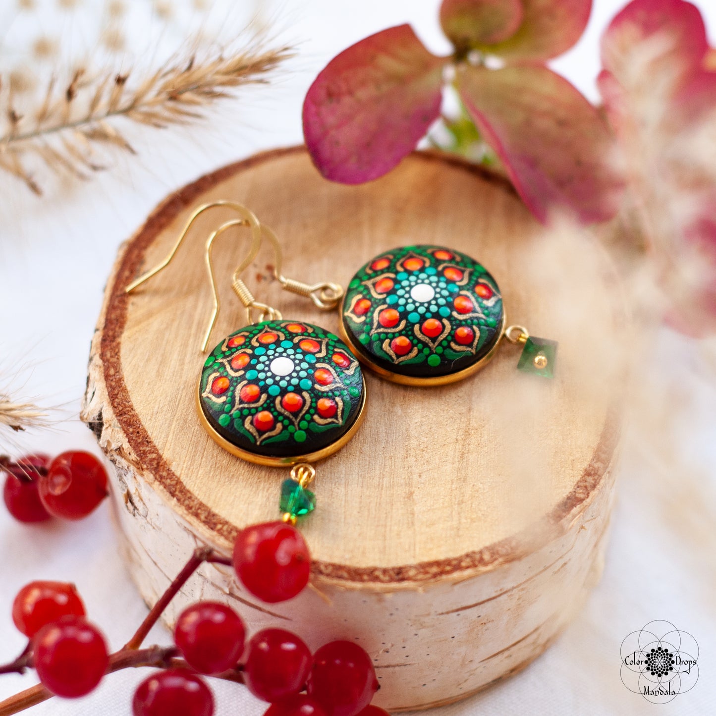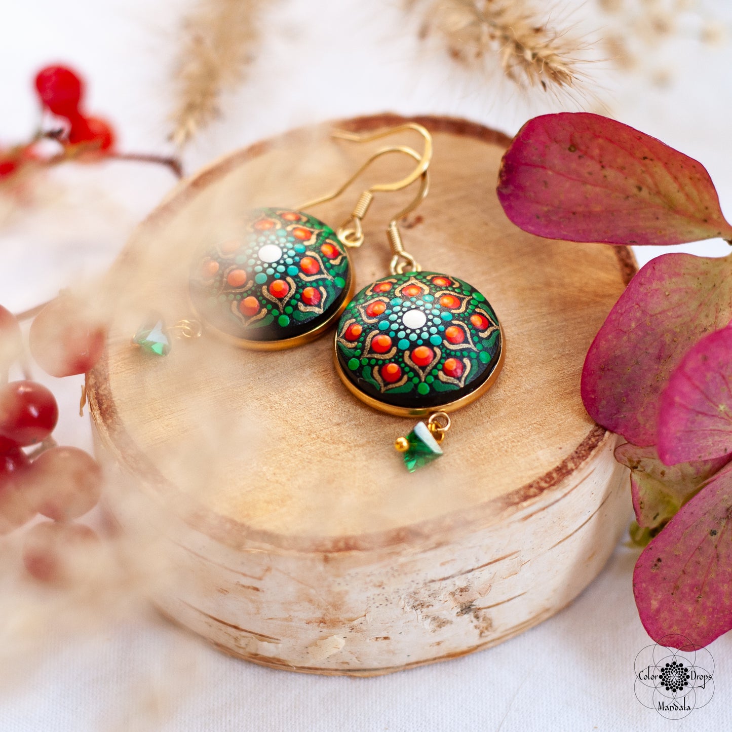 Pictați manual pe lemn, cerceii sunt foarte ușori și confortabili. Culorile au fost atent alese pentru a obține un efect cromatic deosebit, ce te încurajează să cultivi și să împărtășești generozitatea și iubirea în viața ta.. Fiecare punct a fost pictat cu multă grijă și cu migală, ca tu să te simți unică și specială purtându-i.