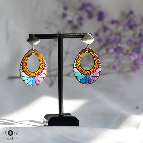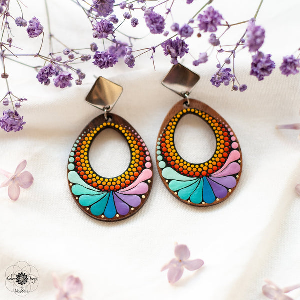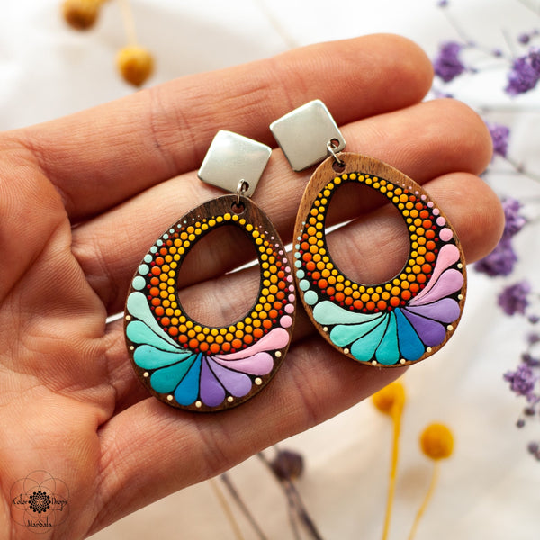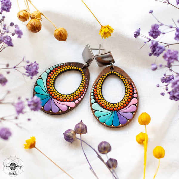 Pictați manual pe lemn, cerceii mandala sunt foarte ușori și confortabili. Culorile au fost atent alese pentru a obține un efect cromatic deosebit, ce te va ajuta să îți păstrezi pozitivitatea și energia pe parcursul întregii zile. Fiecare punct a fost pictat cu multă grijă și cu migală, ca tu să te simți unică și specială purtându-i.