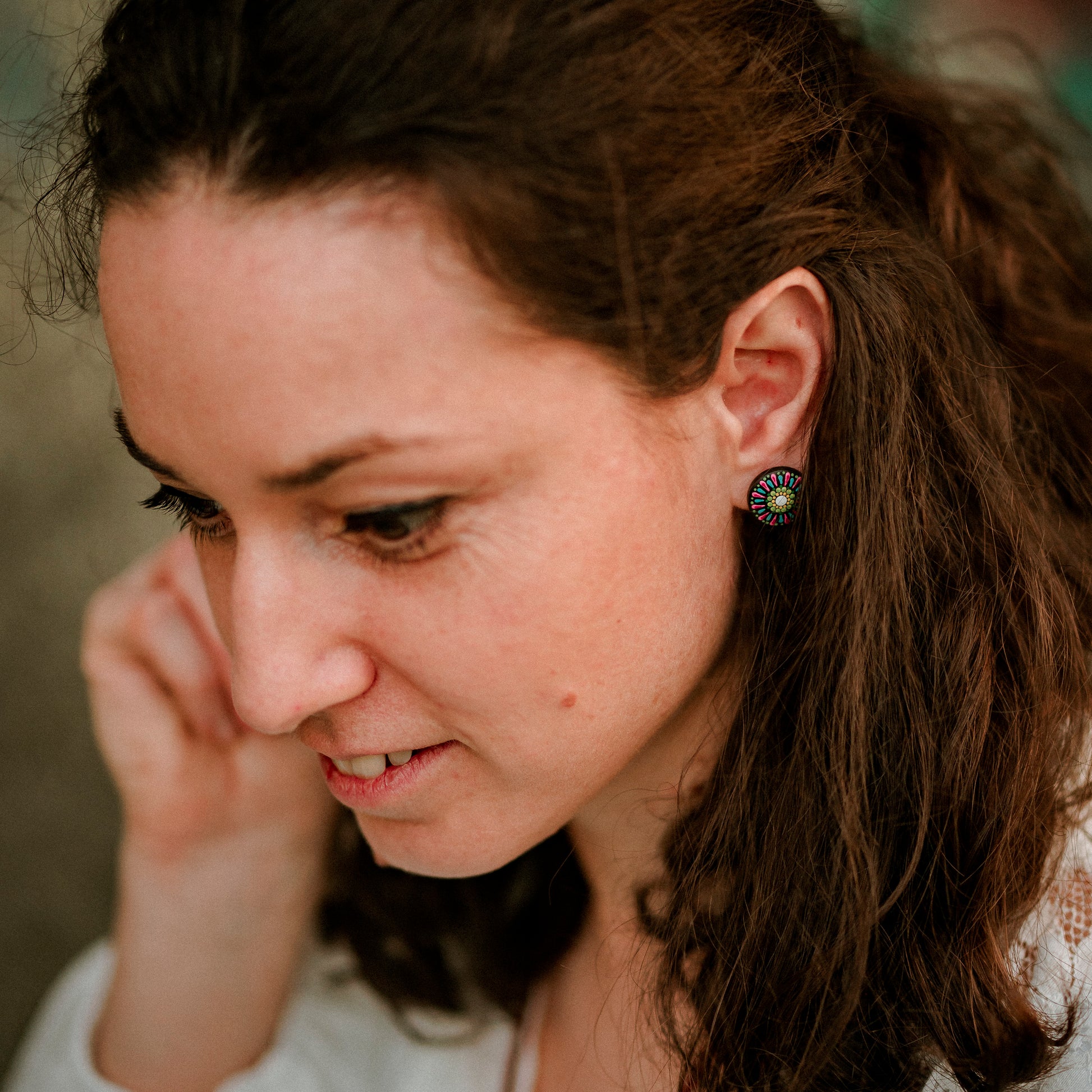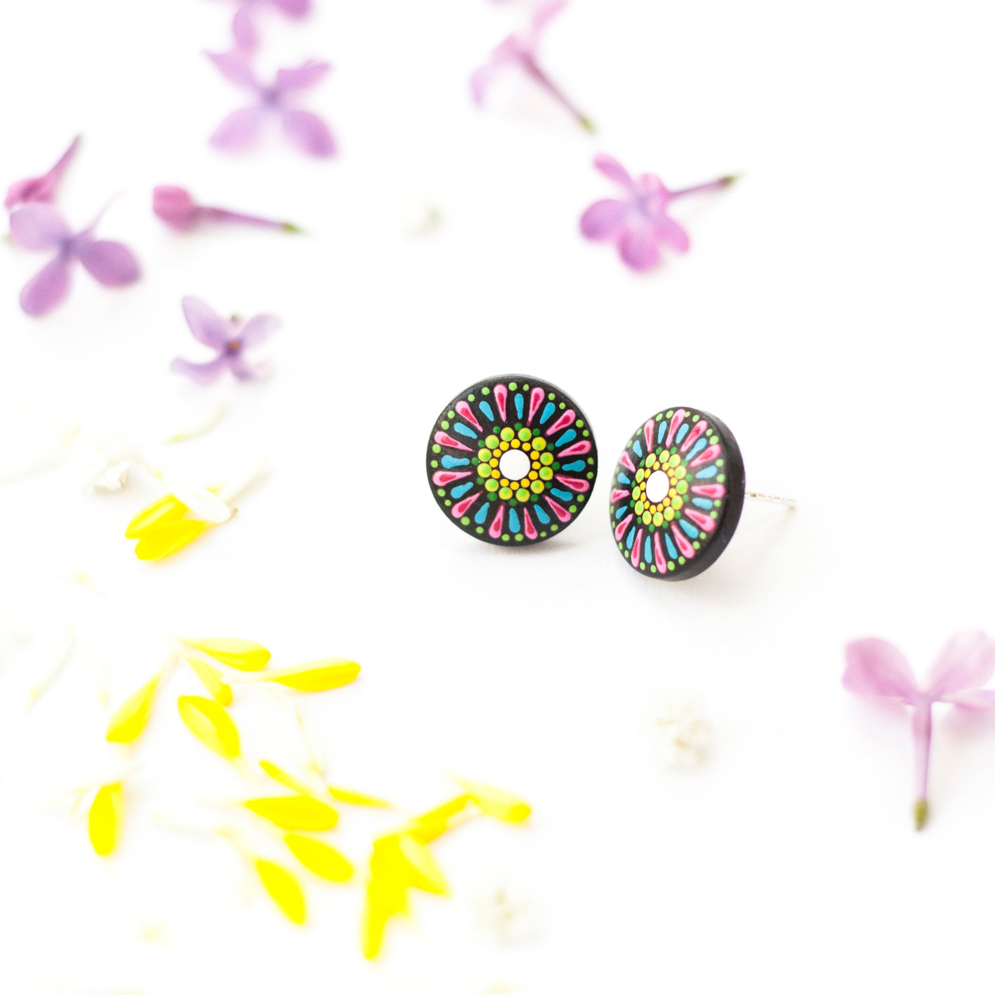 Cercei Mandala, cu model floral, realizați din lemn și pictați manual cu culori acrilice pe bază de apă. Sunt lăcuiți cu două straturi de vernis mat, non-toxic, rezistent la apă.