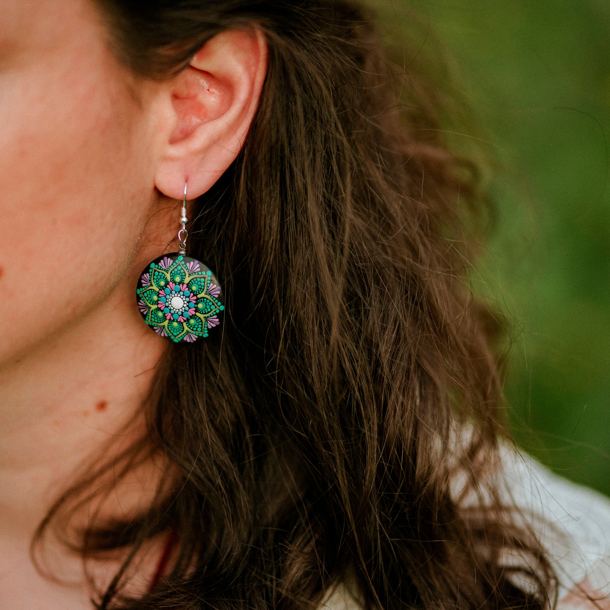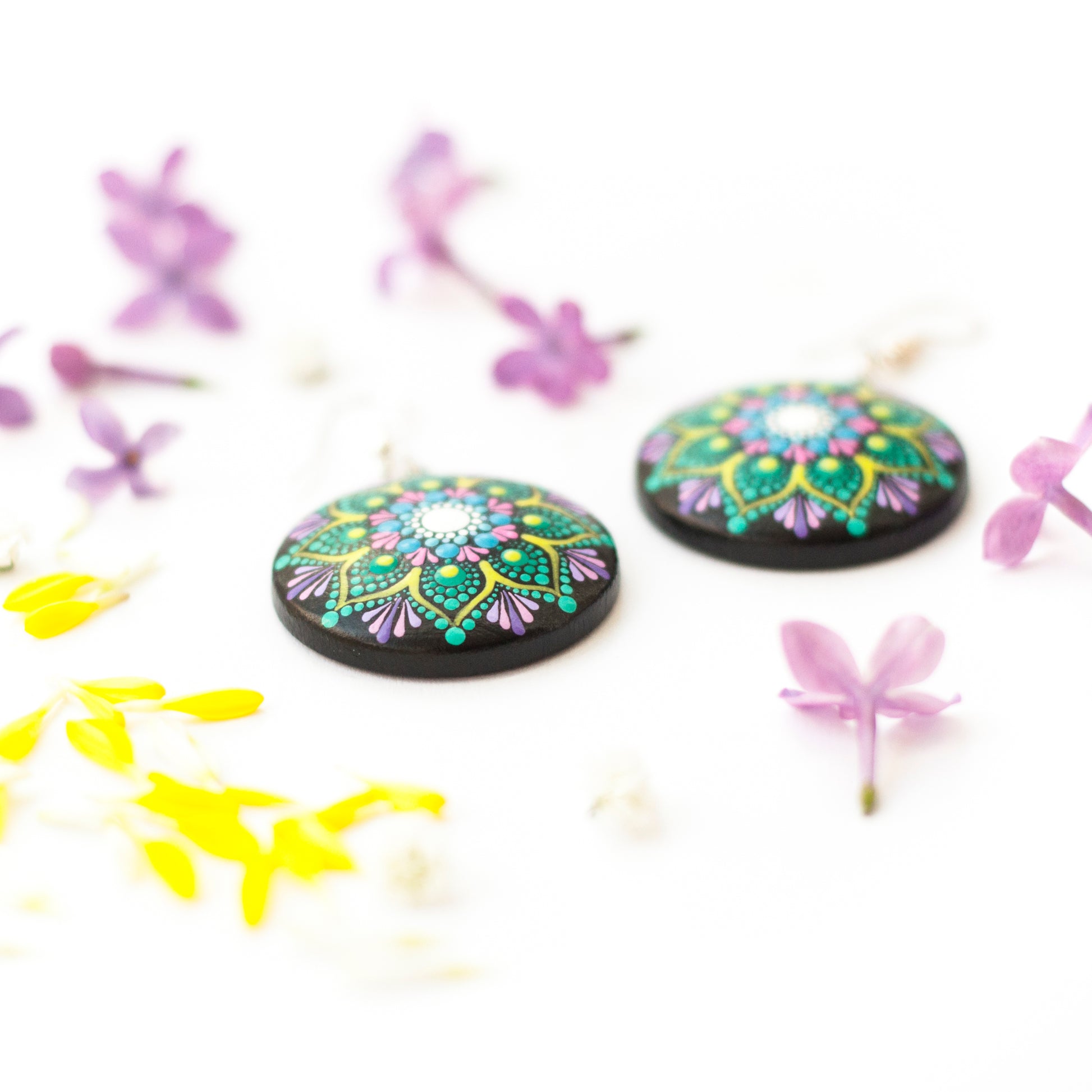 Cercei mandala cu model floral, pictati manual pe lemn, foarte ușori și confortabili. Culorile au fost atent alese pentru a obține un efect cromatic deosebit, ce te va ajuta să iți păstrezi pozitivitatea și energia pe parcursul întregii zile. Fiecare punct a fost pictat cu multă grijă și cu migală, ca tu să te simți unică și specială purtându-i.
