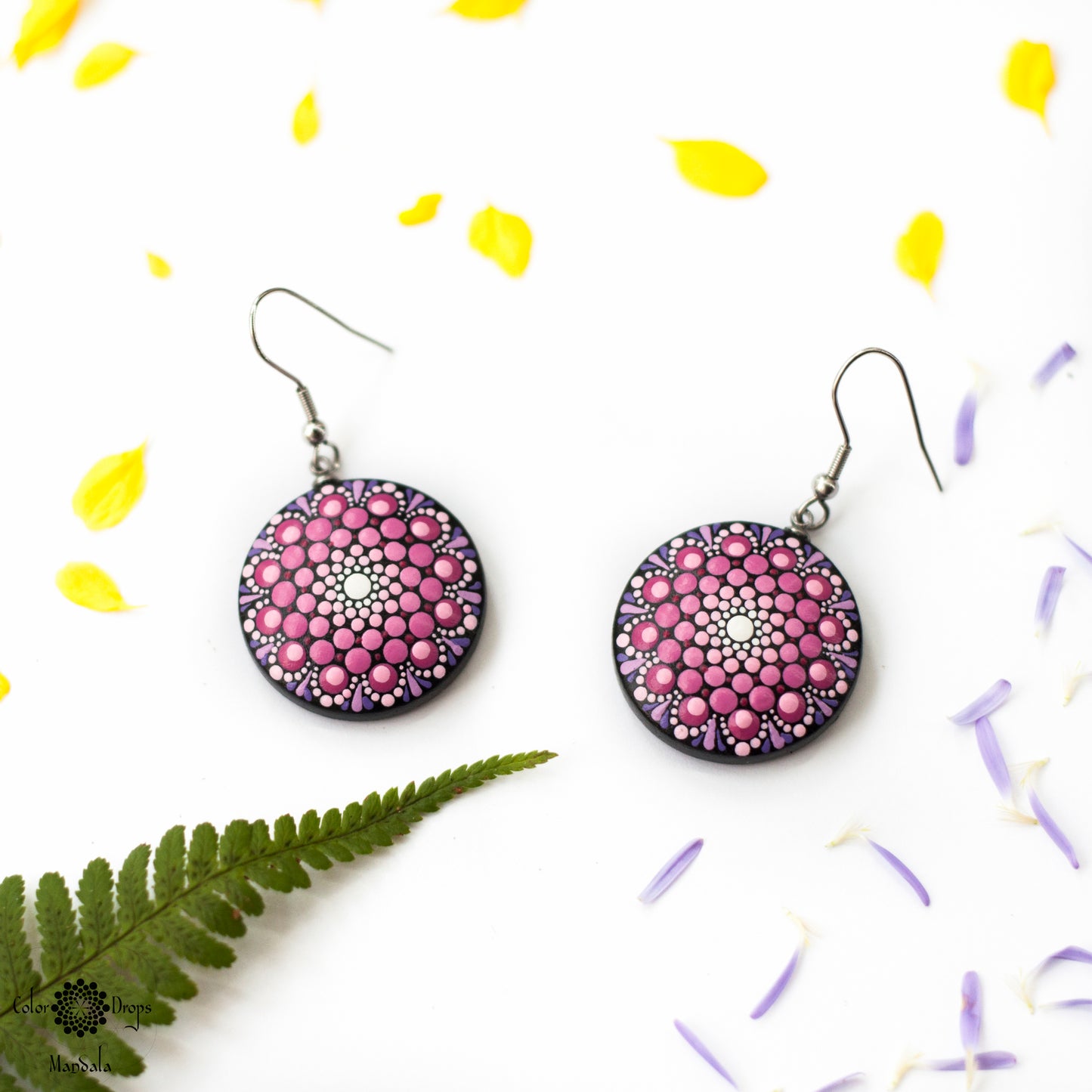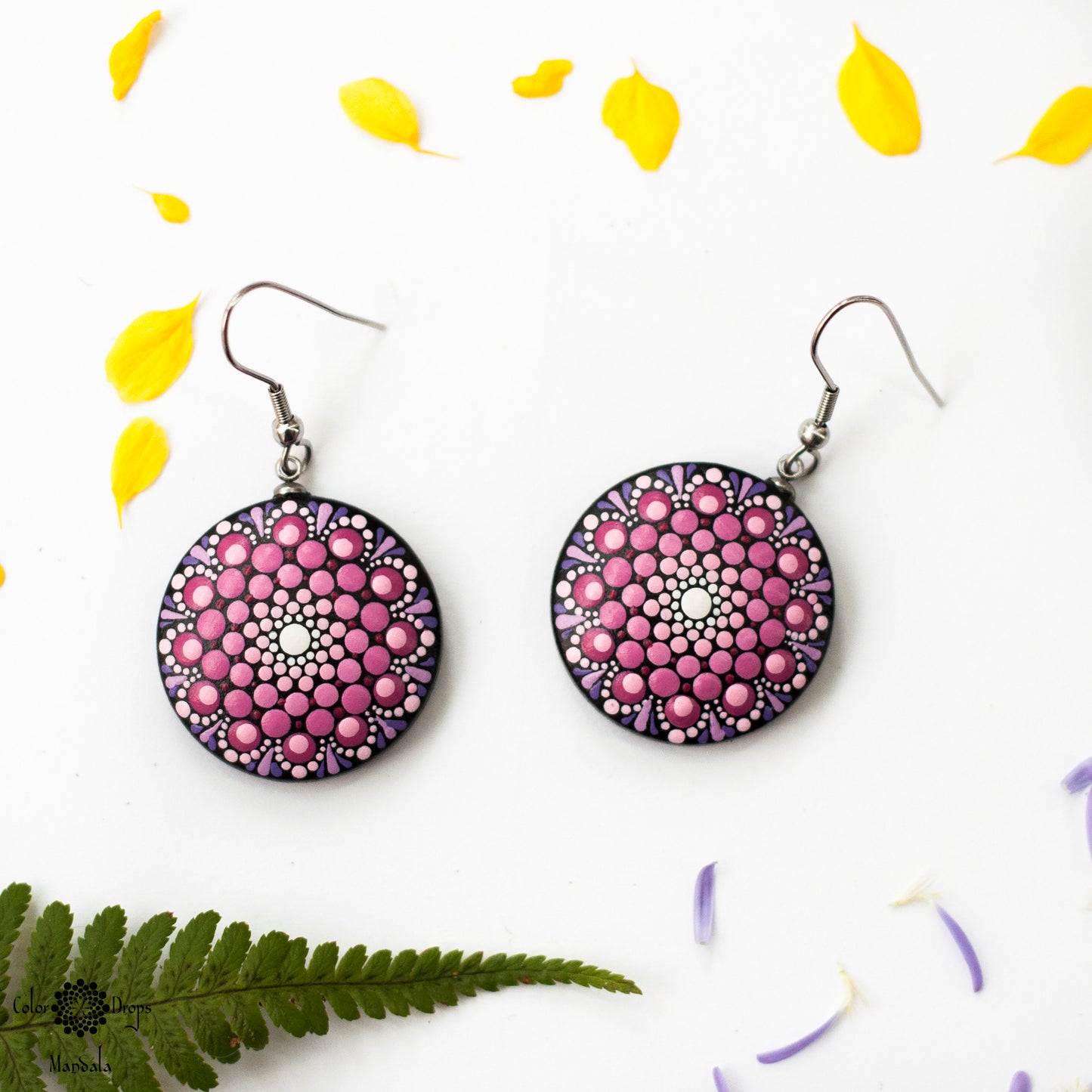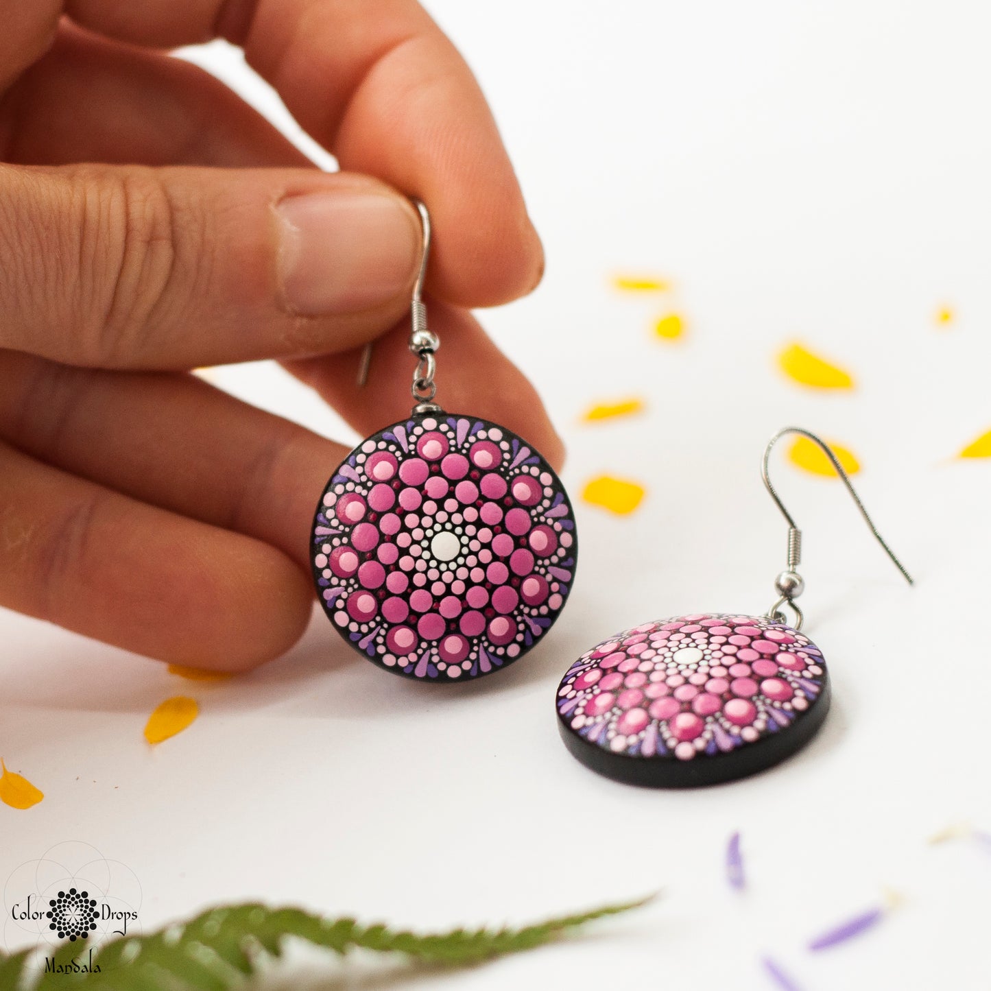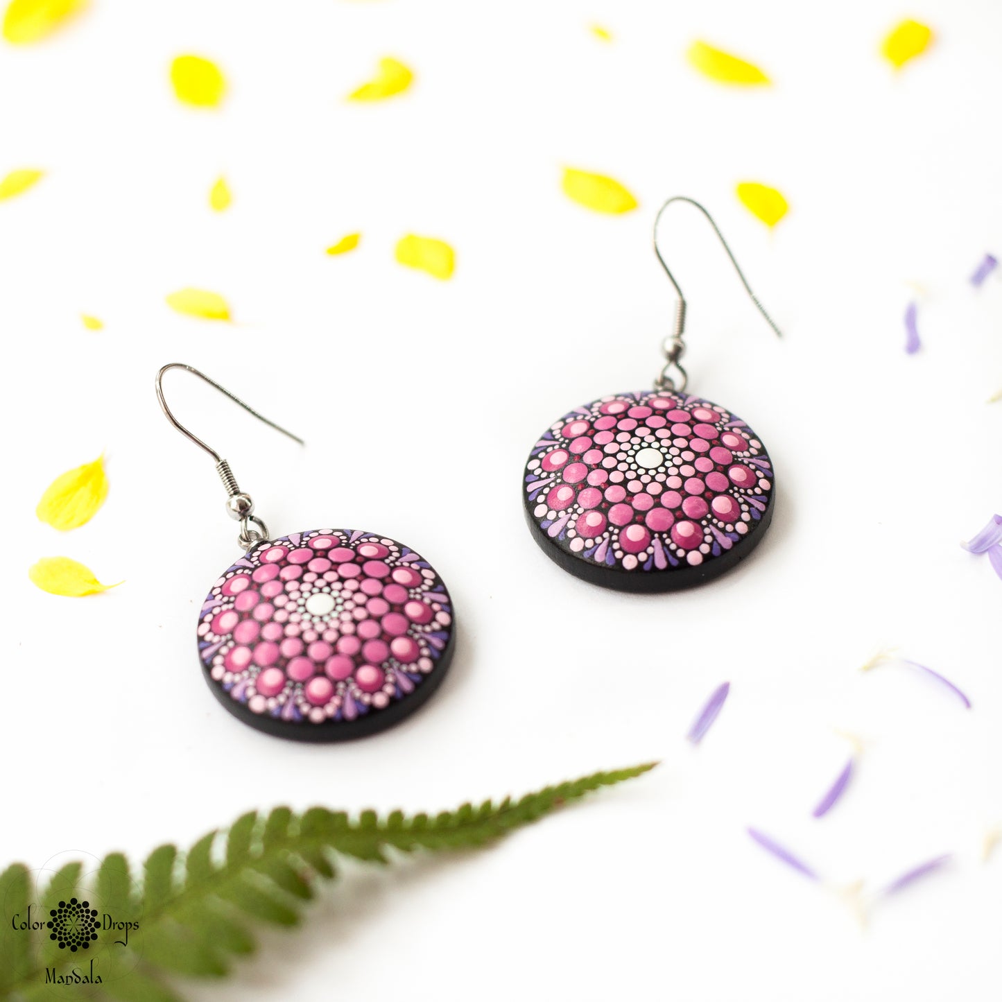 Cercei Mandala ușori și confortabili, realizați din lemn și pictați manual cu culori acrilice pe bază de apă. Cerceii sunt lăcuiți cu două straturi de vernis mat, non-toxic, rezistent la apă.