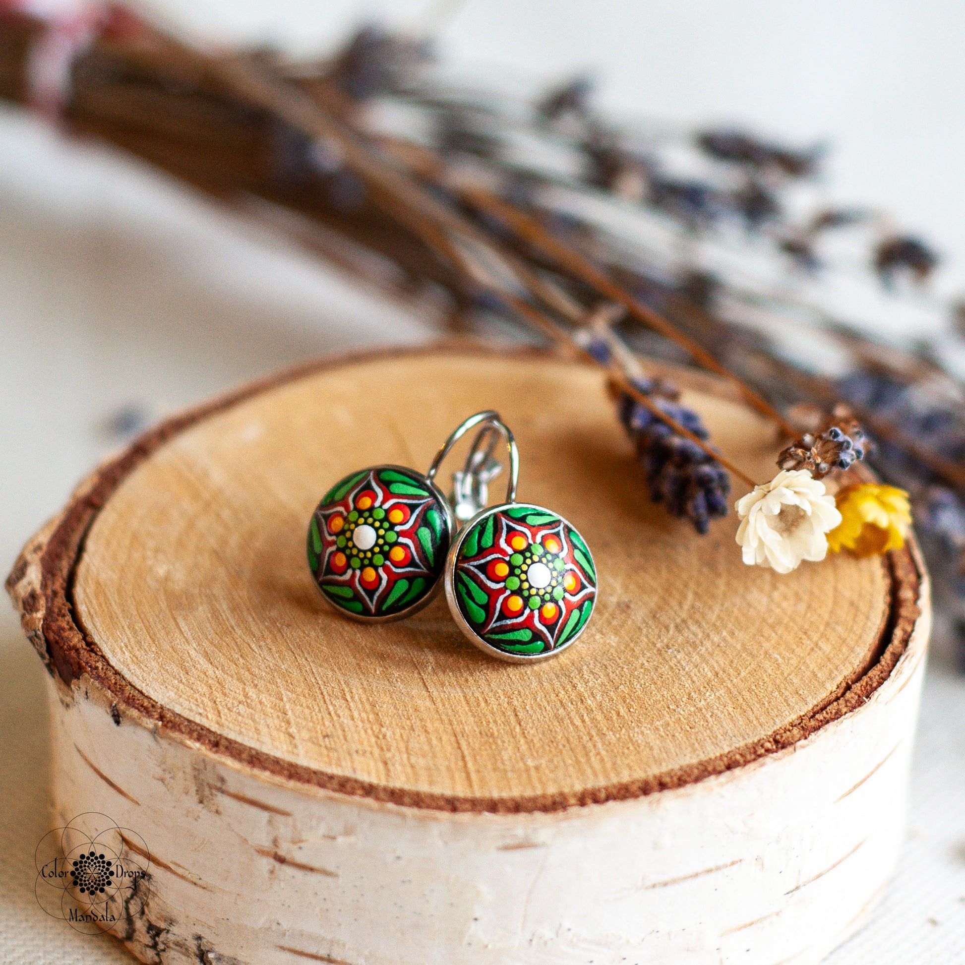 Pictați manual pe lemn, cerceii mandala sunt foarte ușori și confortabili. Culorile au fost atent alese pentru a obține un efect cromatic deosebit, ce te va ajuta să iți păstrezi pozitivitatea și energia pe parcursul întregii zile. Fiecare punct a fost pictat cu multă grijă și cu migală, ca tu să te simți unică și specială purtându-i.