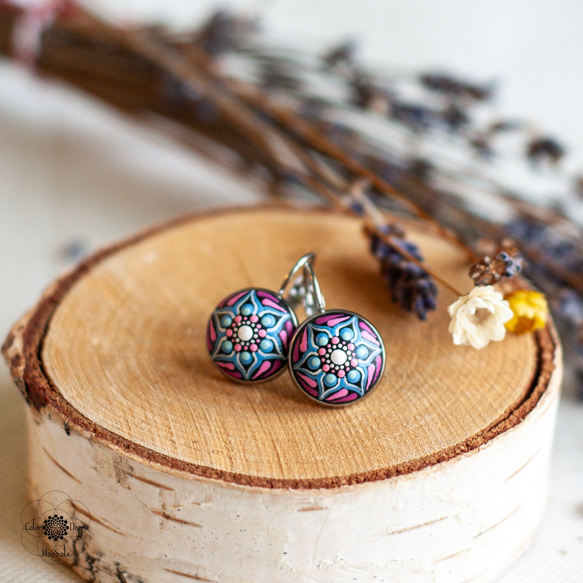 Pictați manual pe lemn, cerceii mandala sunt foarte ușori și confortabili. Culorile au fost atent alese pentru a obține un efect cromatic deosebit, ce te va ajuta să iți păstrezi pozitivitatea și energia pe parcursul întregii zile. Fiecare punct a fost pictat cu multă grijă și cu migală, ca tu să te simți unică și specială purtându-i.