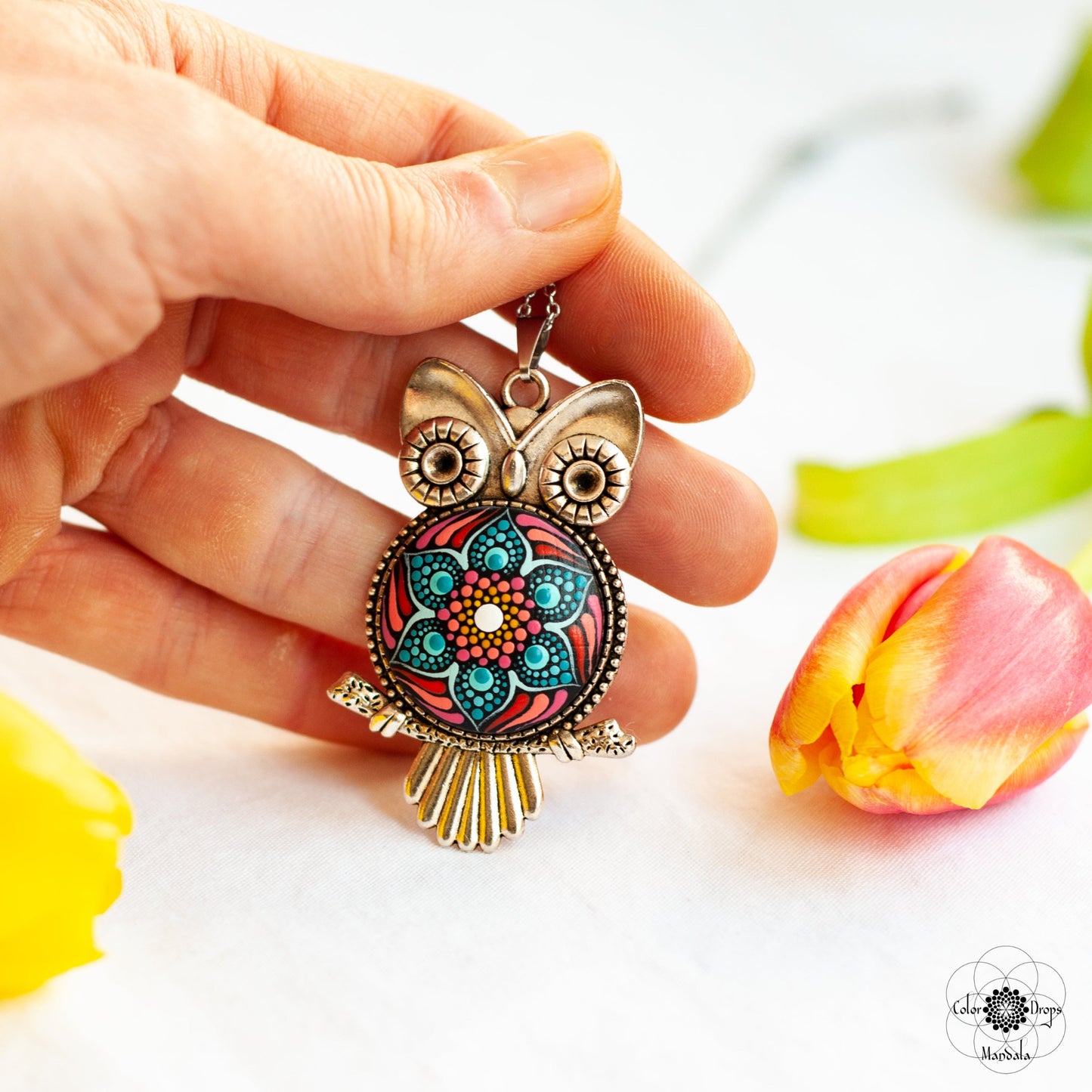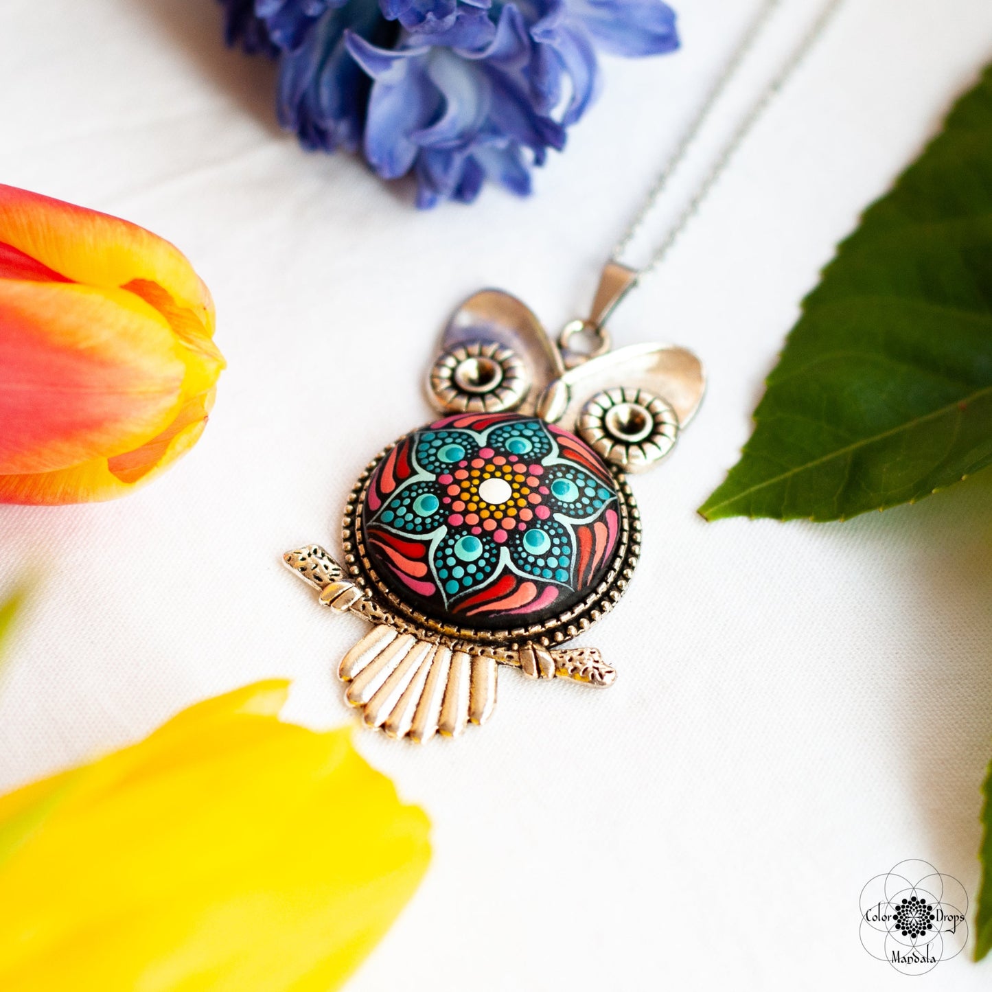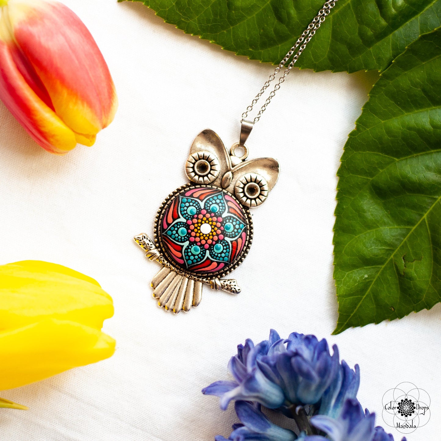 - Pandantiv bufniță, cu model mandala, pictat manual pe lemn cu culori acrilice pe bază de apă. Produsul este lăcuit cu două straturi de vernis mat, non-toxic, rezistent la apă.