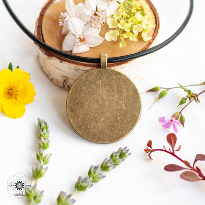 - Pandantivul vine împreună cu un colier la baza gâtului, din șnur de piele, cu încuietoare din aliaj de zinc și accesorii din alamă, fără nichel.