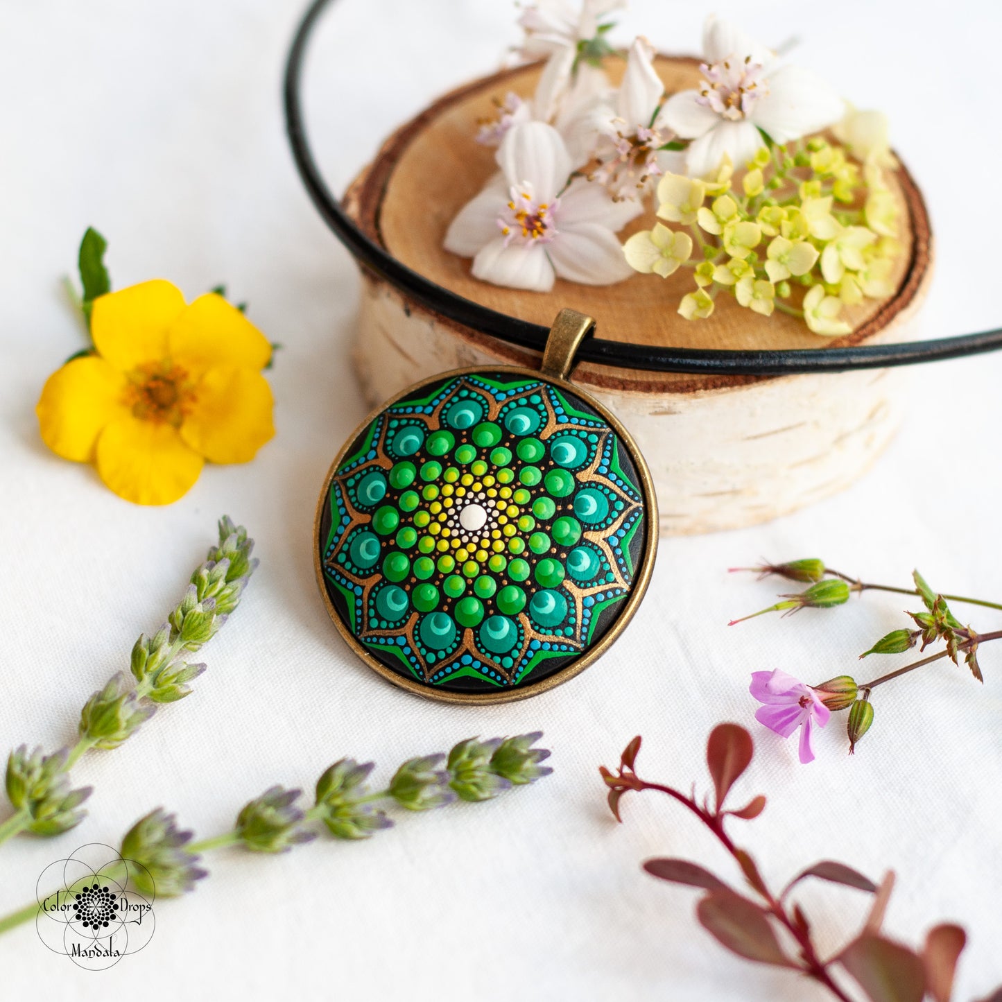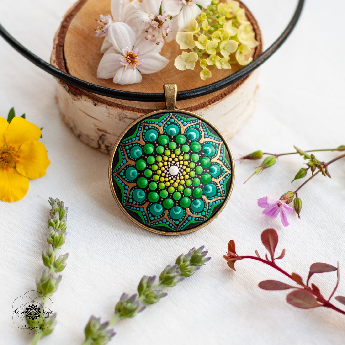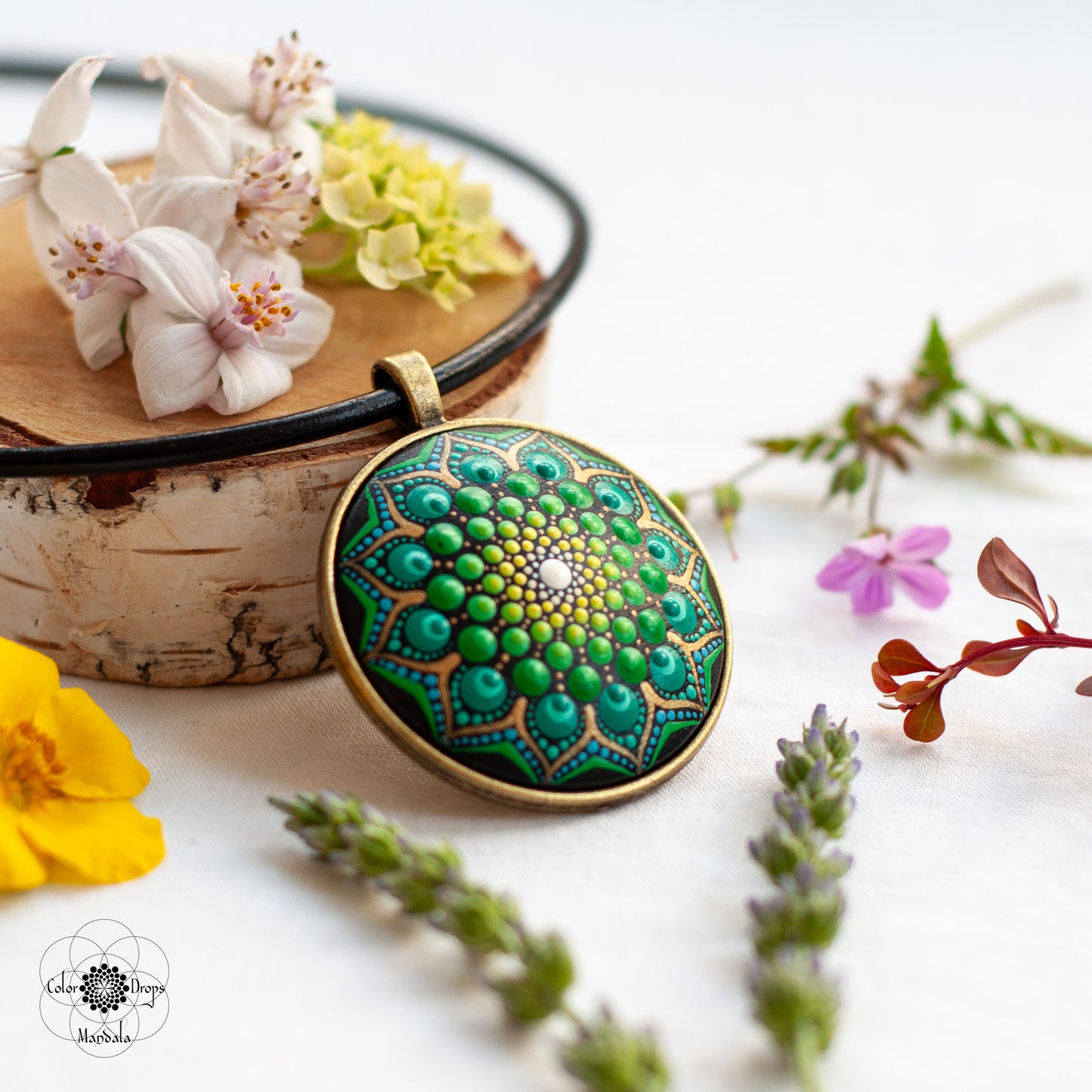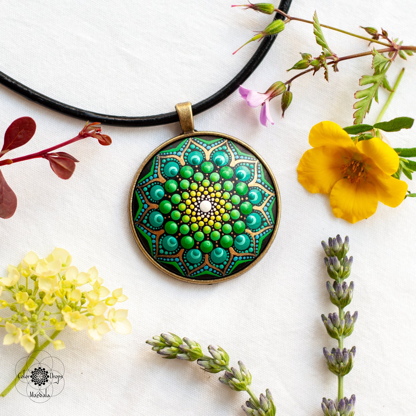 Pictat manual pe lemn, în nuanțe de verde care îndeamnă la echilibru, armonie și relaxare, colierul "Vivid Nomad" este ușor de purtat, dar greu de uitat.