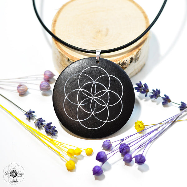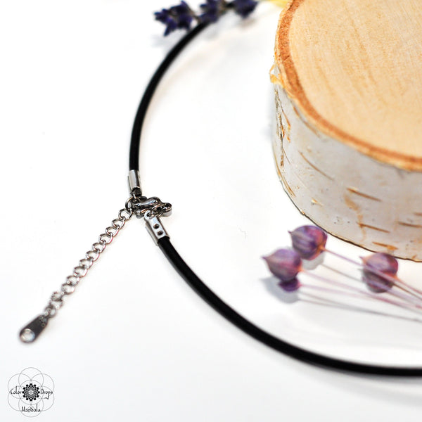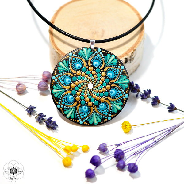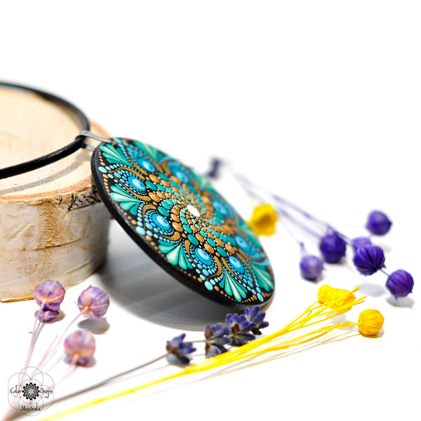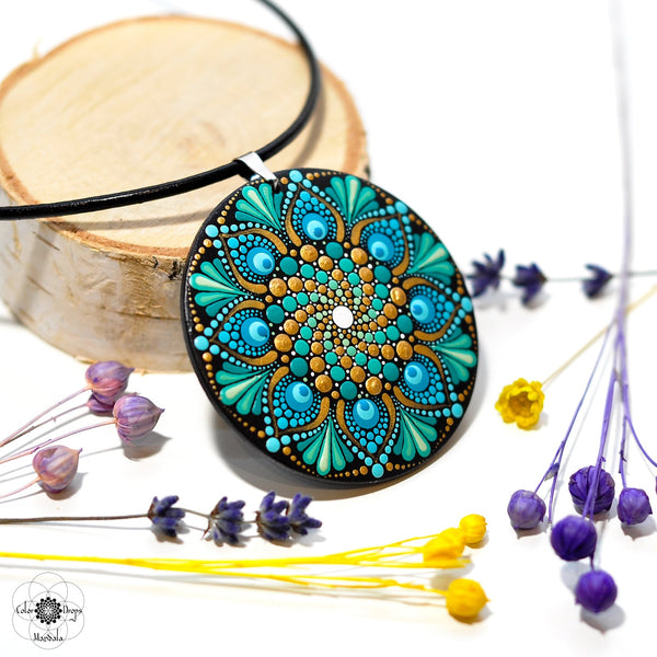 Pandantiv pictat manual pe lemn cu culori acrilice pe bază de apă, lăcuit cu două straturi de verniș mat, non-toxic, rezistent la apă, pe colier din piele naturală accesorizat cu elemente din oțel inoxidabil.
