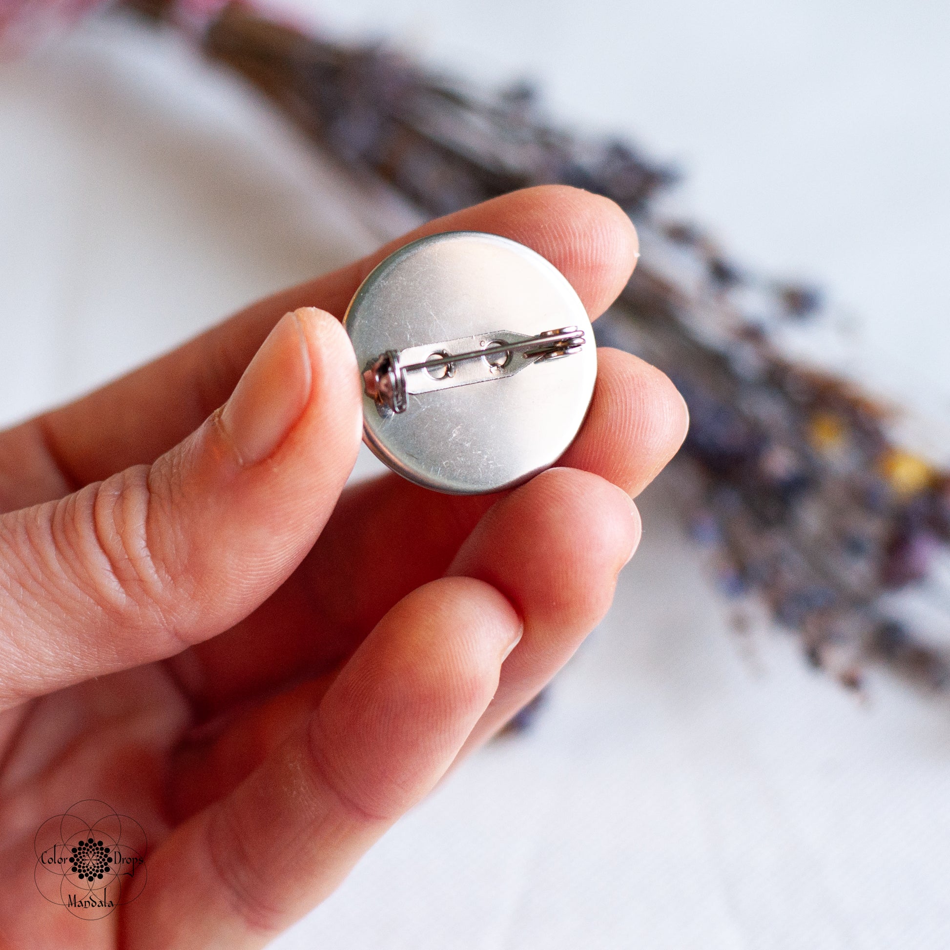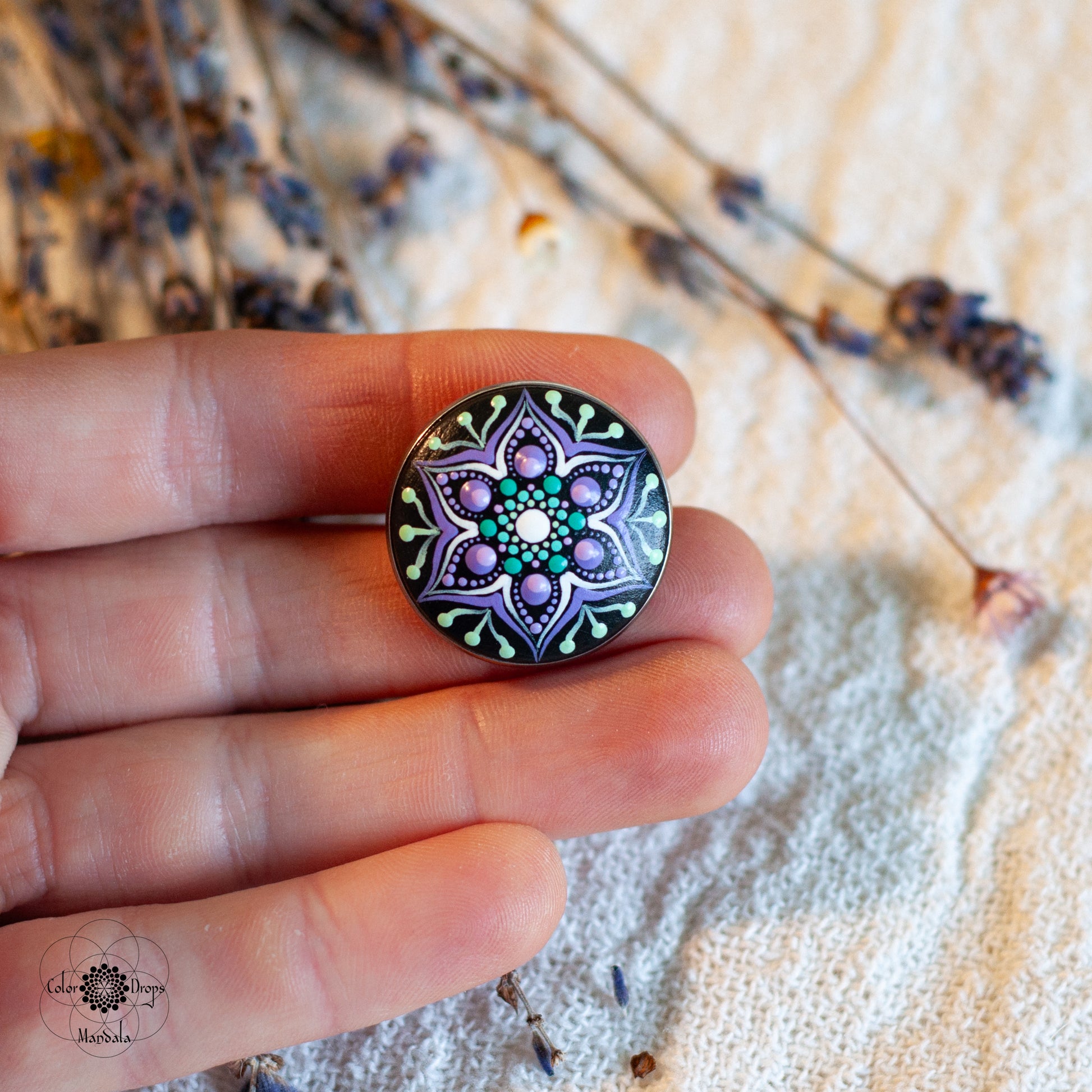 - Broșă Mandala, cu model floral, realizată din lemn și pictată manual cu culori acrilice pe bază de apă. Produsul este lăcuit cu două straturi de vernis mat, non-toxic, rezistent la apă, ce îi oferă o rezistență sporită.