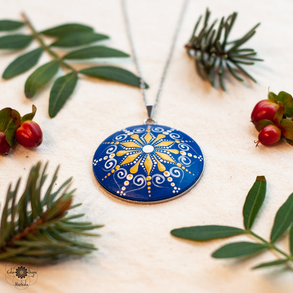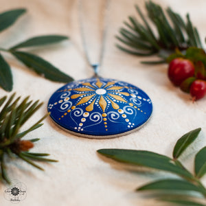Descoperă colierul "Majestic Winter", o bijuterie ce îți aduce mai aproape de suflet farmecul iernii. Pictat cu nuanțe de alb și auriu pe un fundal de un albastru intens, te duce cu gândul la o noapte magică de iarnă cu cer senin împodobit cu milioane de stele.