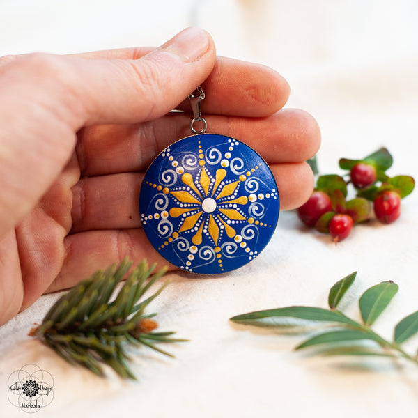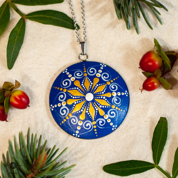 Pandantiv pictat manual pe lemn cu culori acrilice pe bază de apă, lăcuit cu două straturi de verniș mat, non-toxic, rezistent la apă, pe lanț din oțel inoxidabil.
