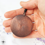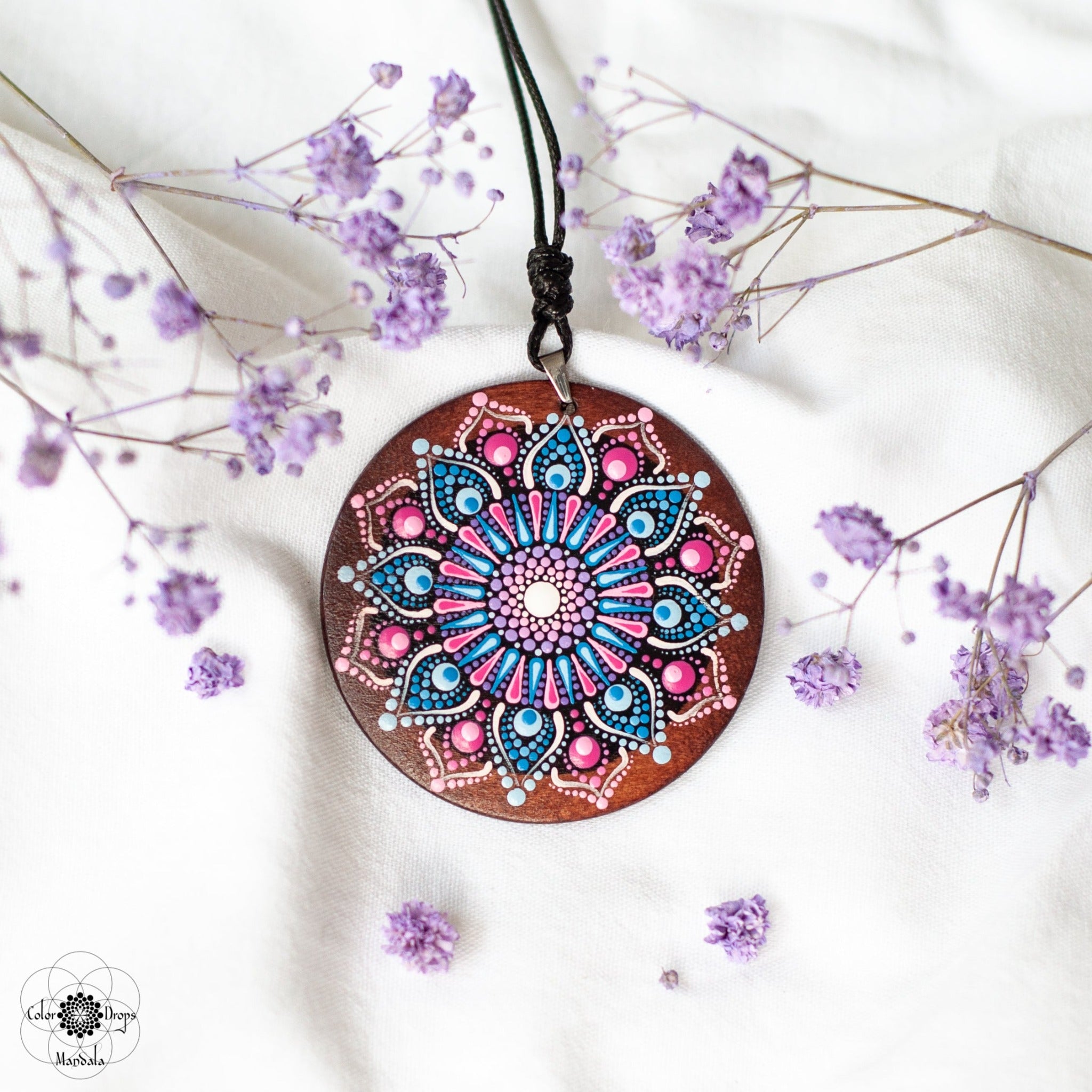 Pandantiv pictat manual pe lemn cu culori acrilice pe bază de apă, lăcuit cu două straturi de verniș mat, non-toxic, rezistent la apă, pe colier textil accesorizat cu elemente din oțel inoxidabil.