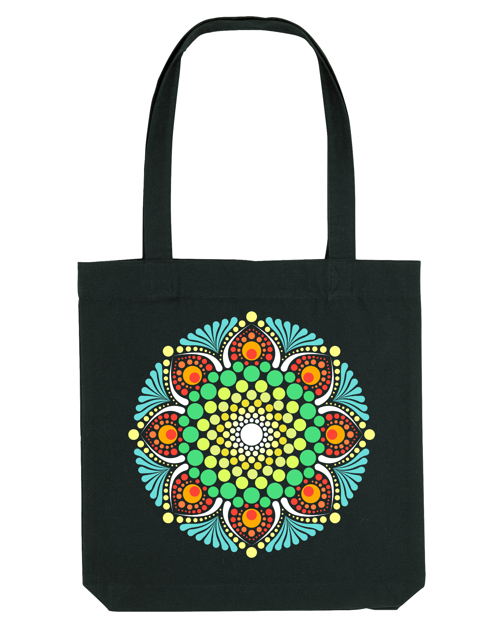 Gentuță pentru umăr din bumbac organic, imprimată cu o mandala veselă și colorată ce te va ajuta să fii zen indiferent dacă o porți la cumpărături, la gym, în drum spre birou sau la plajă.